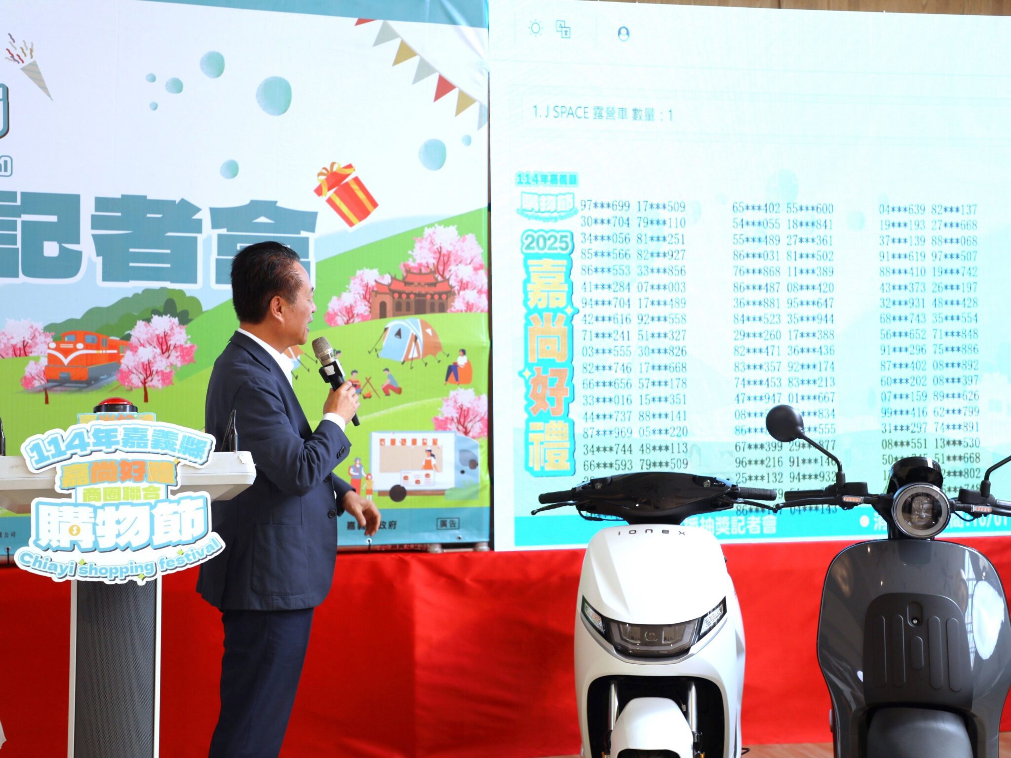 嘉義縣政府攜手19個商圈及大嘉義觀光工廠協會,推出為期兩個月的「商圈聯合購物節」,活動期間累計消費金額突破7.2億元,經濟效益亮眼,今(9)日在縣府舉辦直播抽獎,由縣長翁章梁親自抽出最大獎J SPACE露營車並致電幸運得主表達恭賀。
