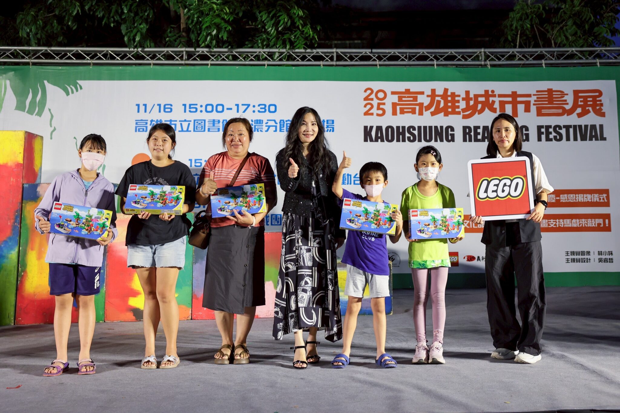 今年高雄城市書展亦展現公私協力的文化能量。義利捷國際貿易股份有限公司鍾景雲董事長、李美青董事長伉儷承續其父鍾兆銘校長的教澤,讓善行綿延,持續支持美濃分館各項營運及公益計畫,造福鄉里,今年適逢美濃分館開館十週年,特舉辦「感恩揭牌儀式」,感謝跨越世代的善行義舉;樂高®台灣亦捐贈30組價值超過千元的積木盒組支持書展與館慶,提升孩子參與閱讀活動的動機;FOCASA馬戲團與拉縴人歌手則以專業演出跨界響應,讓藝術與音樂走進閱讀場域,帶來兼具視覺與聽覺的文化體驗,歡慶美濃分館十週年生日!