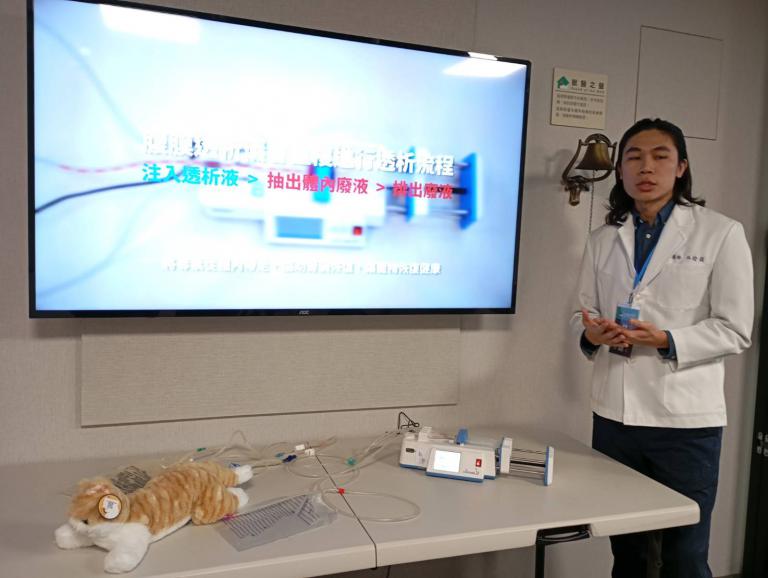 中華民國獸醫師公會全國聯合會譚大倫理事長表示:「日常生活中避免接觸有毒的物質,是避免腎衰竭很重要的一環。腹膜透析是一種溫和且有效的治療方式,透過導管將透析液注入腹腔,利用腹膜自然滲透力排出體內毒素與多餘水分,模擬腎臟功能,減輕身體負擔。這種療法適用於急性腎損傷、慢性腎病末期,以及尿毒症或電解質異常,為重症毛孩提供穩定的治療選項。」