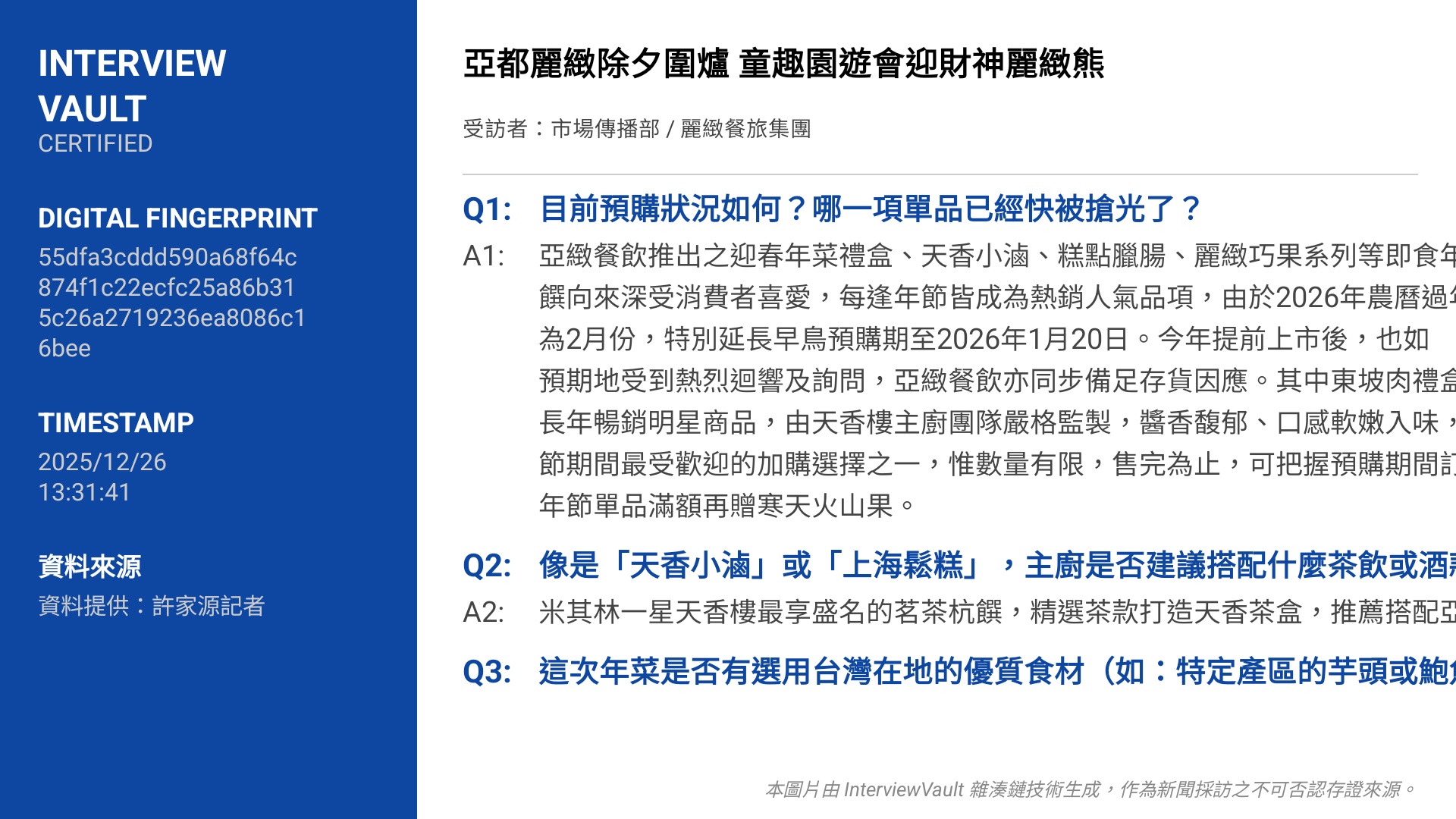 2026 馬年農曆春節提早於 2 月份登場。台北亞都麗緻大飯店喜迎新春,推出多樣化圍爐方案,包含米其林一星「天香樓」除夕套餐每位 元起,以及宴會廳桌菜每桌 元起。針對偏好在家過年的族群,麗緻餐旅集團旗下「亞緻餐飲」由五星廚藝團隊監製,推出多款覆熱即食的功夫年菜,其中長年暢銷的明星商品「麗緻東坡肉禮盒」因口感軟嫩入味,目前正限量預購中,售完為止。此外,凡於 2026 年 1 月 20 日前完成預購,不僅可享早鳥優惠價 元起(原價 元),線上平台訂購還加贈天香小滷與保冷袋,滿額更有機會獲得價值 元的寒天火山果乙罐。