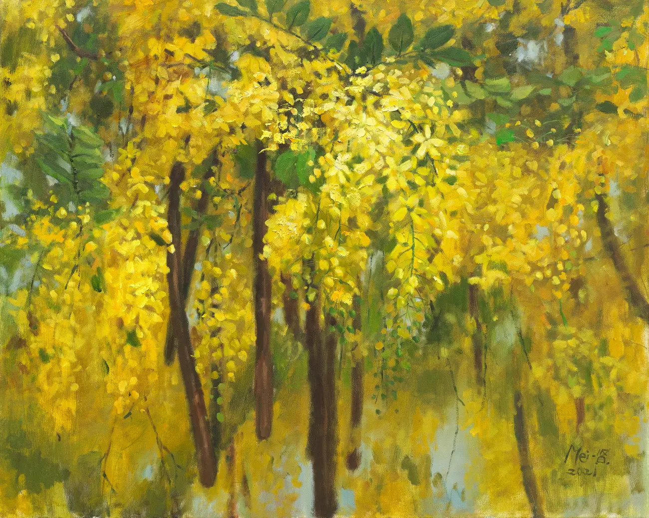 黃美賢此次捐贈《黃金雨阿勃勒》,象徵四層意義:嘉大校花、吉祥意涵、嘉義遍植阿勃勒的城市意象,以及作品光彩明亮寓意嘉大師生校友無論身在何處皆能發光。