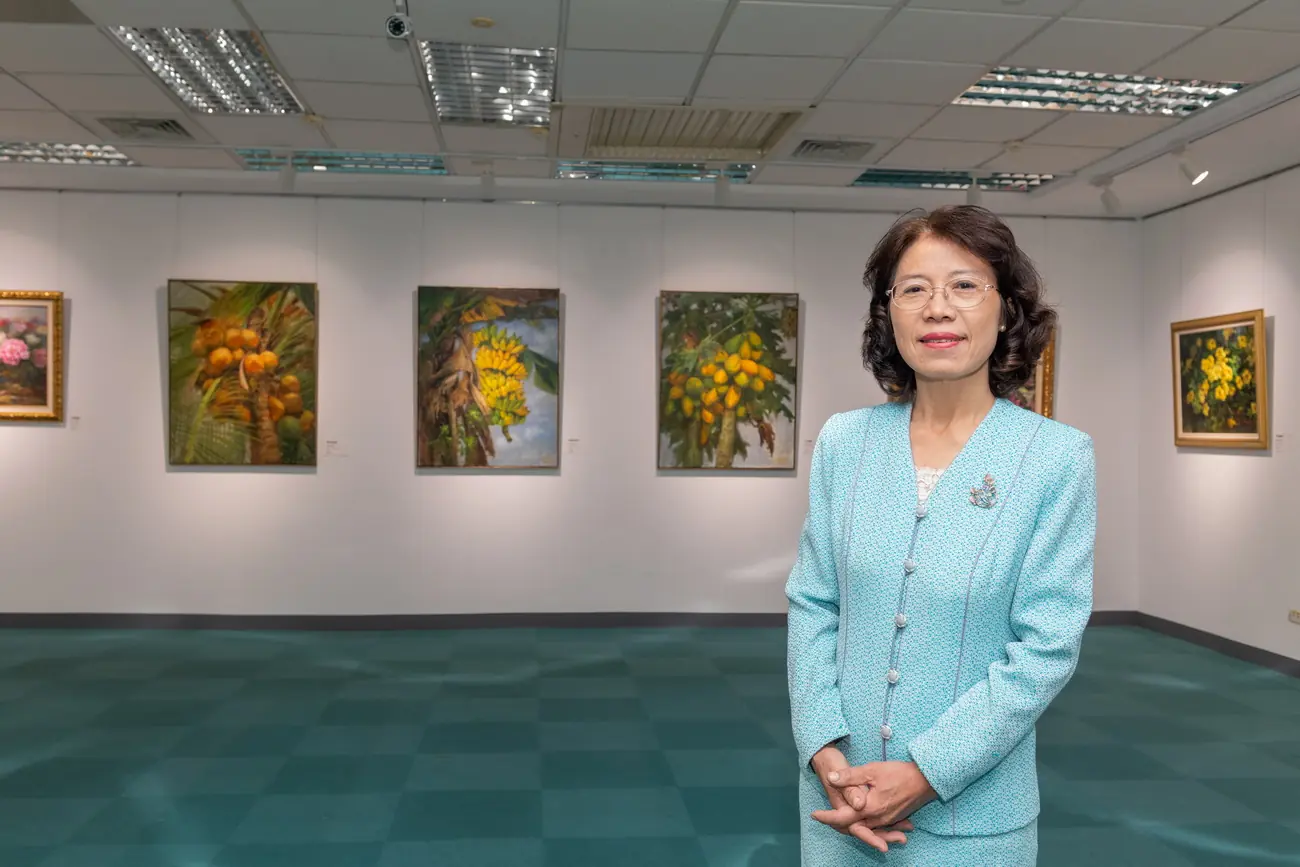 ▲「台灣田園花果畫家」黃美賢博士以花果畫作表達對師長栽培與母校嘉大培育的感恩。(圖/嘉大提供)