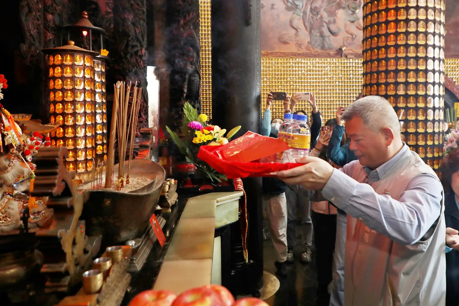 嘉義市政府財政稅務局限量推出「金馬耀富貴」紅包袋、幸福米,以及臺灣銀行嘉義分行特別提供發財水來迎接2026丙午馬年,祝福嘉義市喜氣盈門。今(14)日於嘉義文財殿舉行祈福儀式,副市長林瑞彥代表黃敏惠市長,與台灣銀行嘉義分行副理劉信榮一同出席參香祈福。期盼透過三方福氣加持,各行各業皆能如金馬奔騰般蓬勃發展、富貴臨門。