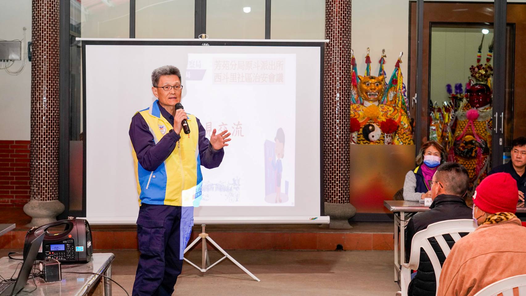 會議中,警方針對近期的犯罪趨勢、交通安全等議題進行宣導,並傳授里民防竊、防詐、防搶等實用技巧。此外,為了與里民互動,會議特別規劃了「有獎徵答」流程,並準備精美小禮物,鼓勵里民踴躍參與,加深對治安議題的認識。