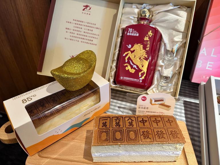 ▲「GOLDEN一路發長條蛋糕」綿密的北海道牛奶蛋糕烙印喜氣的麻將圖案,增添新年一路發的魅力;「媽祖酒廠建廠70周年紀念酒」以富貴紅瓶身搭配飛騰金馬,象徵事事順利、成功之意。(圖╱記者孔亮云翻攝)