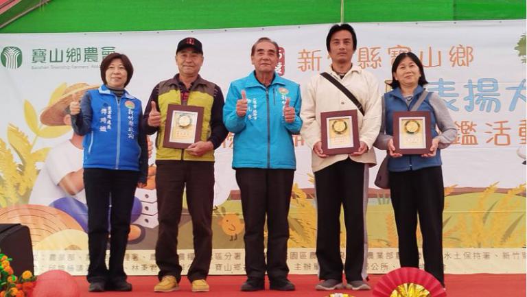 寶山鄉農會今天盛大慶祝農民節,並表揚模範農民,新竹縣政府第二副縣長徐元棟、農業處長傅琦媺頒獎表揚模範農民,讚許寶山農民在農業領域的傑出表現,讓寶山鄉成了名副其實的寶山。
