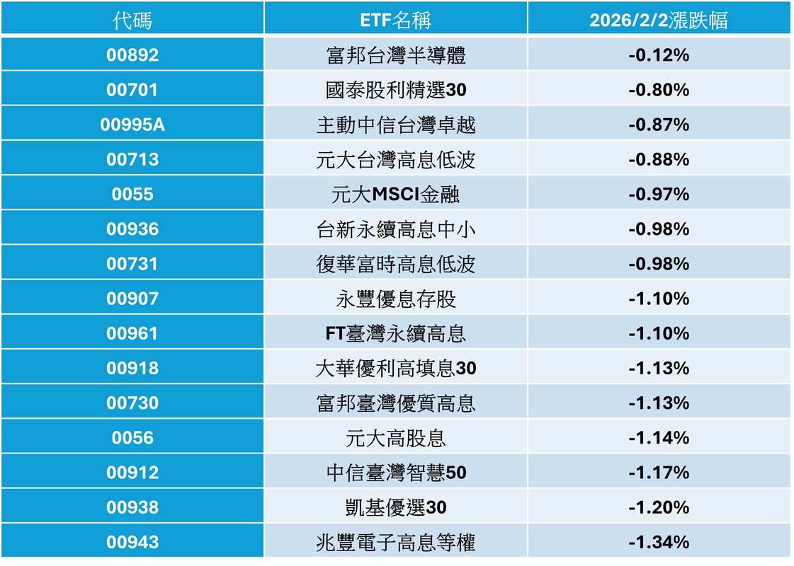 台股昨(2)日受國際市場震盪拖累,加權指數跌幅達1.37%,不過,仍有15檔台股ETF表現優於大盤,以高股息ETF占多數。值得留意的是,屬於科技型ETF的富邦台灣半導體(00892)僅小跌0.12%,逆勢成為當日抗跌王。另主動型ETF中,僅主動中信台灣卓越(00995A)跌幅小於大盤,績效排名台股ETF第三,顯示其主動選股結合量化策略,在震盪市況下展現一定防禦力。