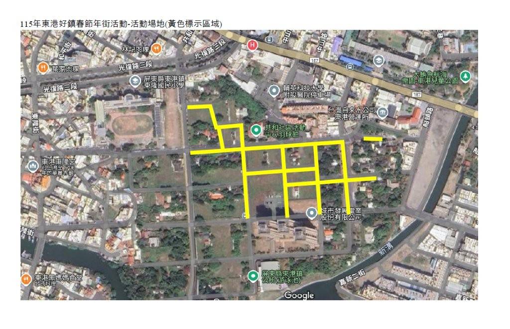 東港鎮公所舉辦「115年東港好鎮春節年街暨珍惜水資源活動」,將於115年2月16日至2月20日(每日活動時間下午16時至24時),在東港鎮共和社區熱鬧登場,活動現場有樂團街頭藝人表演、氣墊樂園、特色童玩、市集等活動內容,預期將迎來許多民眾湧入,請民眾務必遵從員警、義交人員指揮管制。