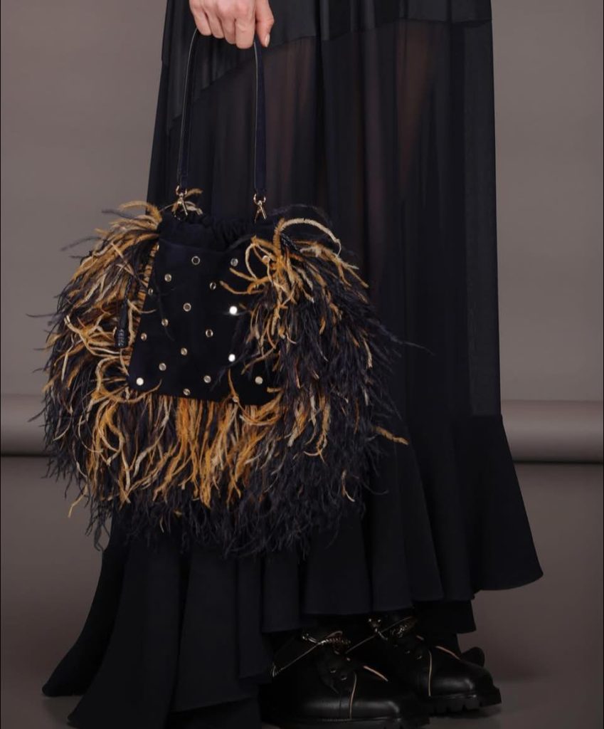 上身是絲質印花襯衫的濃烈;下身卻轉為深棕色的輕透長裙。若隱若現的處理方式,反而讓傳統印花不再壓迫,稀釋了過度濃烈的民俗風。