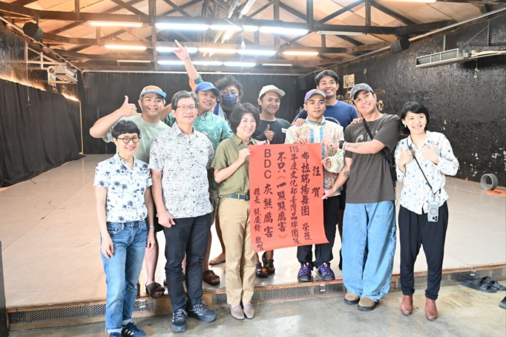 縣長饒慶鈴今日由文化處長李吉崇陪同前往位於臺東糖廠的布拉瑞揚舞團排練場頒發紅榜,為甫結束夏威夷文化交流返臺的舞者們加油打氣。她以部落式幽默稱讚舞團「不只是《一點點厲害》,是灰熊厲害」,肯定舞團從臺東出發,將原住民族文化與當代舞蹈帶向國際舞台,讓世界看見臺東豐厚的文化底蘊。