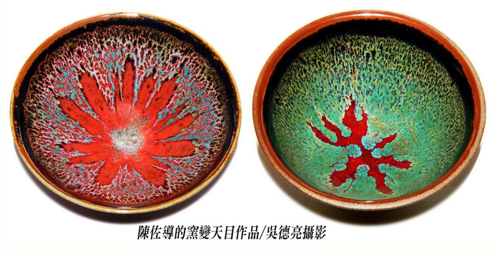 年逾九十仙逝的陳佐導,從一位轟炸機飛官蛻變為國際知名的陶藝大師,作品在兩岸乃至全球都享有盛名,尤以釉色千變萬化的「窯變天目」最受茶人推崇:將黑釉施在深棕色土胎的茶碗上,再施以銅、鐵的窯變釉才投窯燒製;黝黑的天目釉流「薄」處產生了鐵紅、鐵黃等色澤的變化,又因克服了天目釉吸收其他色澤的特性,產生了千變萬化、流釉與自然美麗的窯變色彩,有時彷若星空般的深邃,又有如火焰般的紅艷。