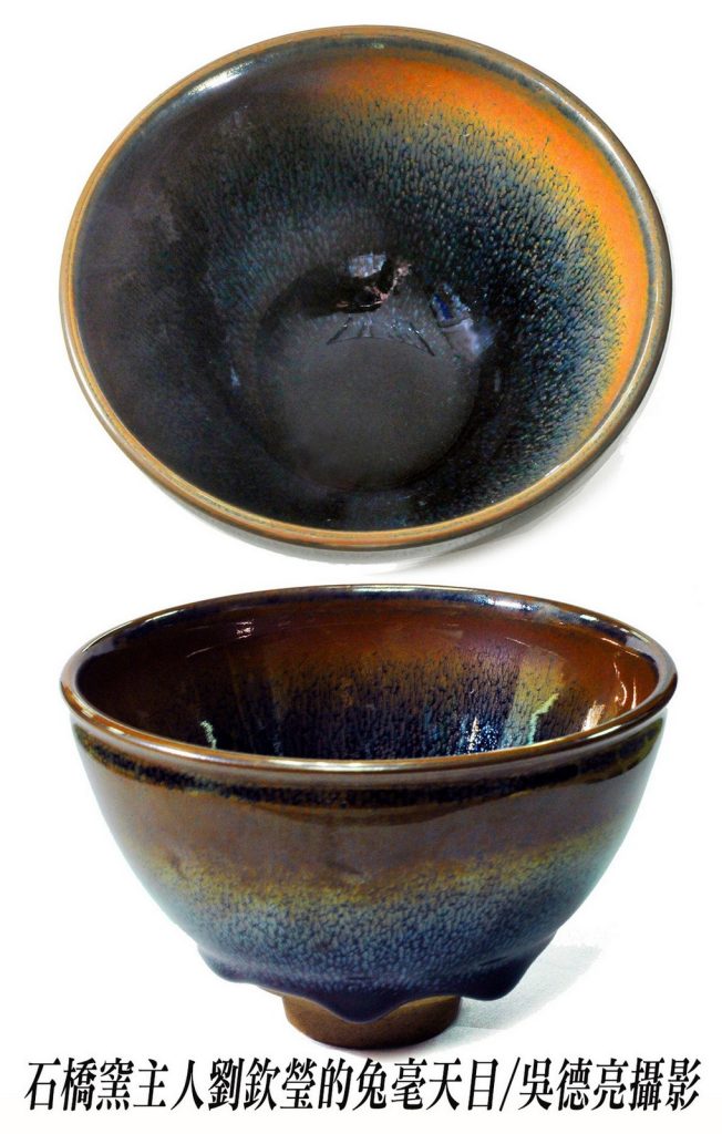 十多年前就在高雄美濃以燒造兔毫天目聞名的劉欽瑩,認為天目黑釉除了胎土、溫度與釉藥必須拿捏得宜,更須超過1300度以上高溫才能燒成,因此胎土調配須避免高溫燒窯破裂。單一色黑釉含鐵份高,經過氧化、中性、還原及交叉運用,鐵分子在窯內氣氛與溫升變化下產生液相分離,冷卻後便會在黑釉面上產生結晶,此時溫度控制更需細膩,成敗之間相差只有10度左右,難度之高可以想見。