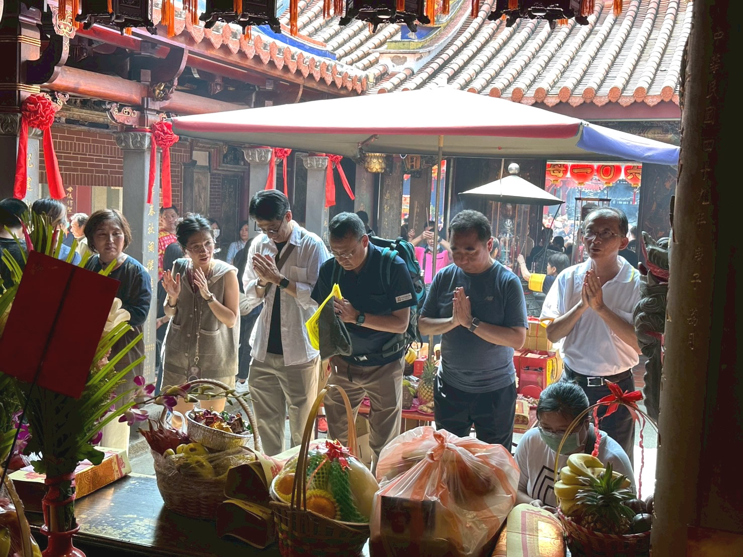 上午,代表團首站前往朴子配天宮。適逢各地進香團陸續抵達,廟埕中人潮絡繹不絕,香火鼎盛,宗教氛圍十分濃厚。熊本市教育委員會委員長遠藤洋路對臺灣民間信仰的熱烈與虔誠深有感觸,他表示這場面「華麗又有趣」,並親自參與了抽籤祈福的儀式,祈願臺日教育及文化交流能更加廣泛與深遠。
