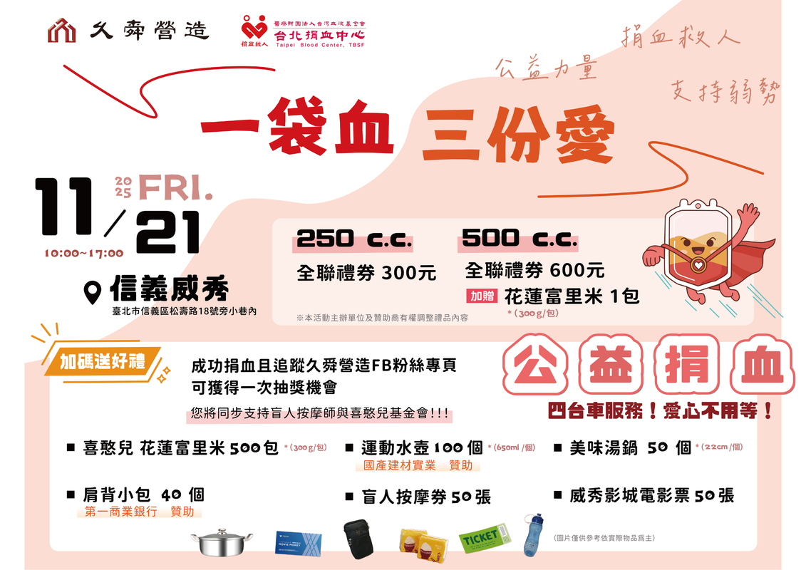 為響應社會公益、傳遞企業關懷,久舜營造將於 11 月 21 日(五)上午 10 點至下午 5 點在信義威秀舉辦「一袋血 三份愛」公益捐血活動。公司號召同仁與協力夥伴一同挽袖捐血,並攜手二十多家產業夥伴及多個公益團體,共同展現「做工的人,也是做公益的人」的社會行動力。