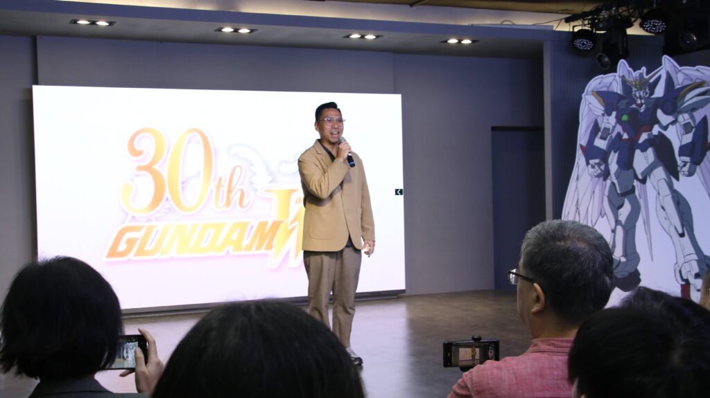台灣萬代南夢宮總經理蕭聖祐(Roger)昨(21日)在記者會上表示希望透過此次的主題店讓消費者能更多認識《新機動戰記鋼彈W》這個IP。(圖/KIRABASE提供)