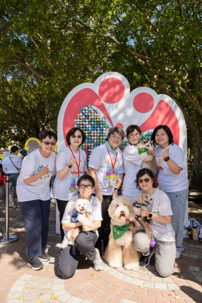 圖說:2025世界安寧日公益路跑「心願追圓滿」- (左一)衛福部劉越萍司長、(中)器捐病主中心李明哲董事長動物與輔助治療貓狗於活動-心願接力牆前合影
