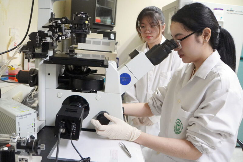 泰國納黎萱大學農業科學系四年級的Suthaphat Rungchat,獲國科會「外籍高階人才來臺實習專案」(International internship pilot program, IIPP)獎助,來臺實習三個月,與黃顗瑄同學共同完成實驗。Suthaphat Rungchat說,她在泰國學習的是傳統漁業養殖,想進一步學習分生科技,她的老師曾在暑假參訪大葉大學生醫系,認為這裡的師資設備都非常好,極力推薦她來此實習,因此申請來臺。在大葉的學習生活是全新的體驗,課堂上師生緊密互動、實驗室中老師手把手指導,實習第一個月就參與了「使用 ImageJ 影像軟體對斑馬魚鳍中黑色素细胞分布之定量分析」研究,並且第一次參加大型學術會議「2025臺灣斑馬魚研討會」,收穫很多,她很期待未來能到台灣攻讀碩士班。