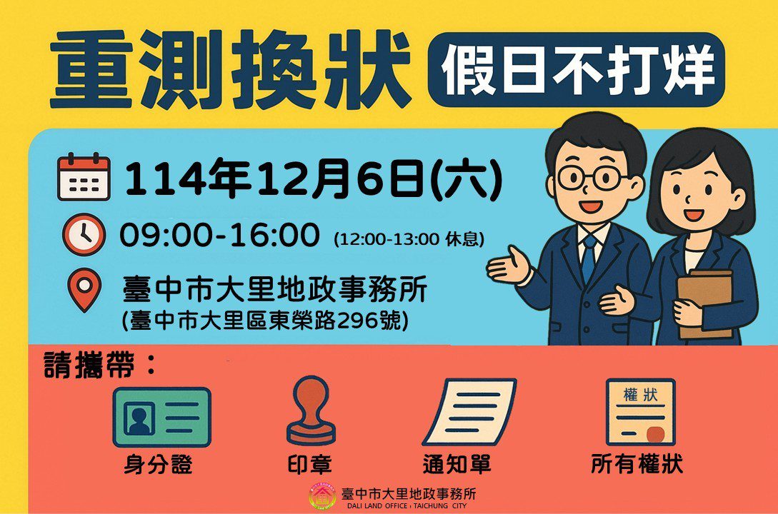 大里地政12月6日辦理「假日不打烊」重測換狀服務 提供市民更貼心便捷的地政服務
